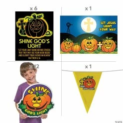 Refresh the look of your Sunday School classroom or faith-based learning space for Halloween with this helpful kit. Featuring a variety of wall decorations with Christian pumpkin themes, these decorations will help kids stay focused on God despite the pervasiveness of Halloween while adding some fun color to the classroom. (25 pcs. per unit) Includes:• 1 Plastic Christian Pumpkin Backdrop Banner (3 pcs. per set. Assembled, 9 ft. x 6 ft. Simple assembly required.)• 12 Cardstock Christian Pumpkin Cutouts (Includes six design cutouts. 12″ – 22″ x 9 3/4″ – 15″)• 11-Pc. Paper Handpicked by God Bulletin Board Set (Includes 52 blank cutouts. 5″ – 27″ x 3 1/2″ – 21″)• 1 Plastic Christian Pumpkin Pennant Banner (100 ft. with 18″ pennants.)• Assortments are subject to change at any time and may vary from picture shown. Substituted items will be similar in nature.