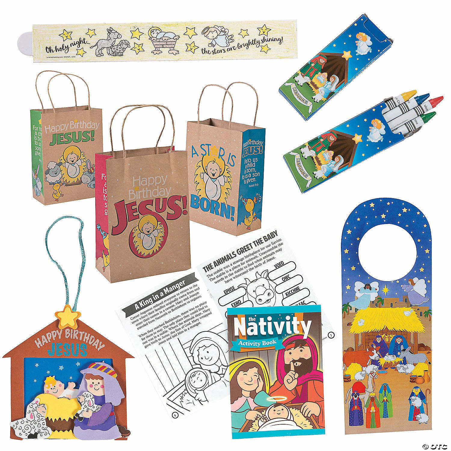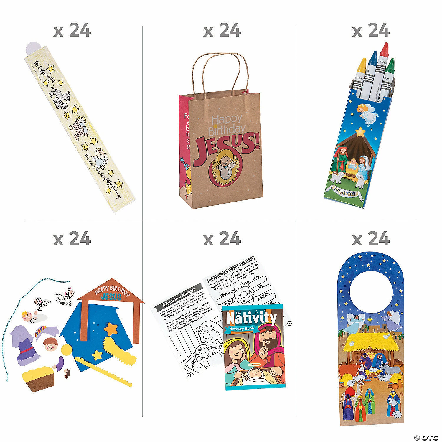 Help teach kids the real meaning of Christmas with these fun crafts! Featuring a wide variety of activities to engage their creativity, this kit has everything you need to keep young believers entertained during church services or events. (144 pcs. per unit) Includes: • 24 Paper Color Your Own Nativity Bracelets (Includes adhesive closure. 9″)• 24 Paper Happy Birthday Jesus Kraft Gift Bags (6 1/2″ x 3 1/4″ x 9″ with 4″ jute handles.)• 24 Foam Happy Birthday Jesus Ornament Craft Kits (Includes self-adhesive foam pieces. 5 1/2″ All craft kit pieces are pre-packaged for individual use. Kits include instructions.)• 24 Nativity Crayon Boxes (Four assorted crayons per Nativity scene box. Safe and non-toxic. 3 1/2″ Conforms to ASTM D-4236.)• 24 Nativity Doorknob Hanger Sticker Scenes (Includes 12 4″ x 10 1/2″ backgrounds and 12 sticker sheets. Stickers are repositionable and acid free. Each sheet contains 72 assorted stickers.)• 24 Paper Nativity Learning Activity Books (5″ x 7″ 12 pgs.)• Assortments are subject to change at any time and may vary from picture shown. Substituted items will be similar in nature.