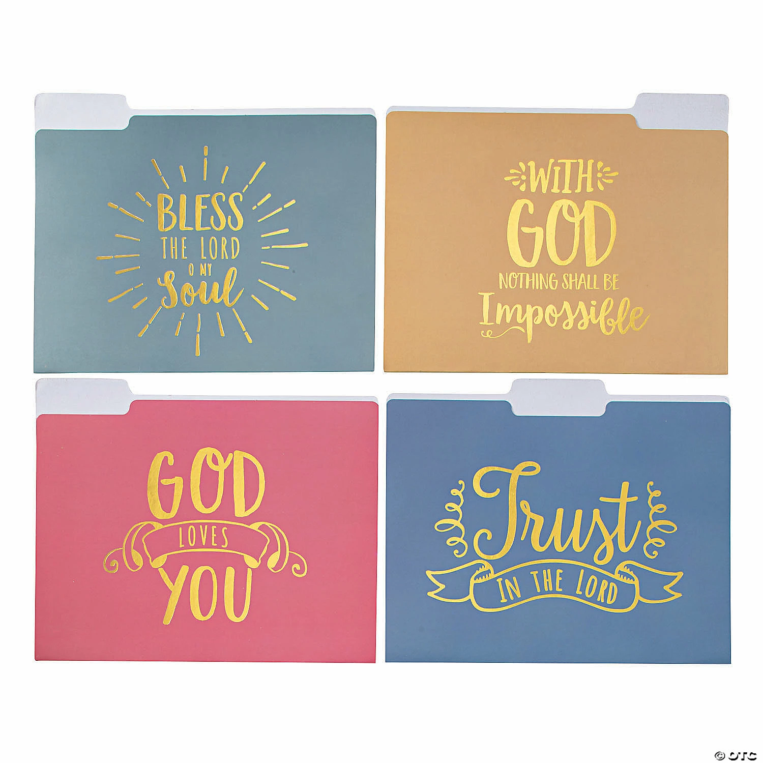 Keep God in all your projects with file folders that feature quotes from the Scriptures in gold foil against richly colored backgrounds. This religious organizational system is a faith-filled office supply that empowers the faithful as it affirms the work of the Lord in our lives. Use them at work or school, or designate a separate folder for each of your Bible study or small groups. Cardstock printed with gold foil. 11 1/2″ x 9 1/2″ ยฉ OTC