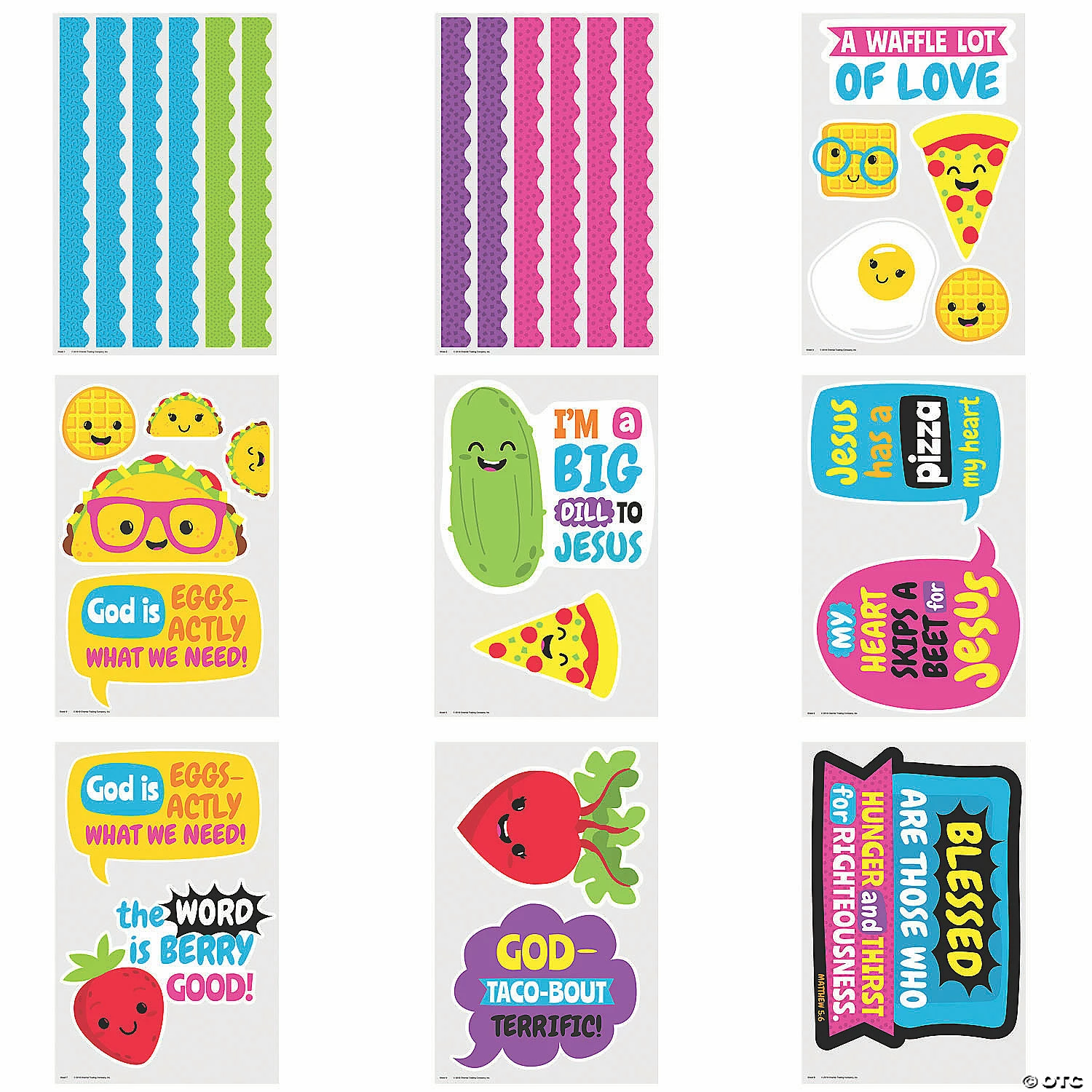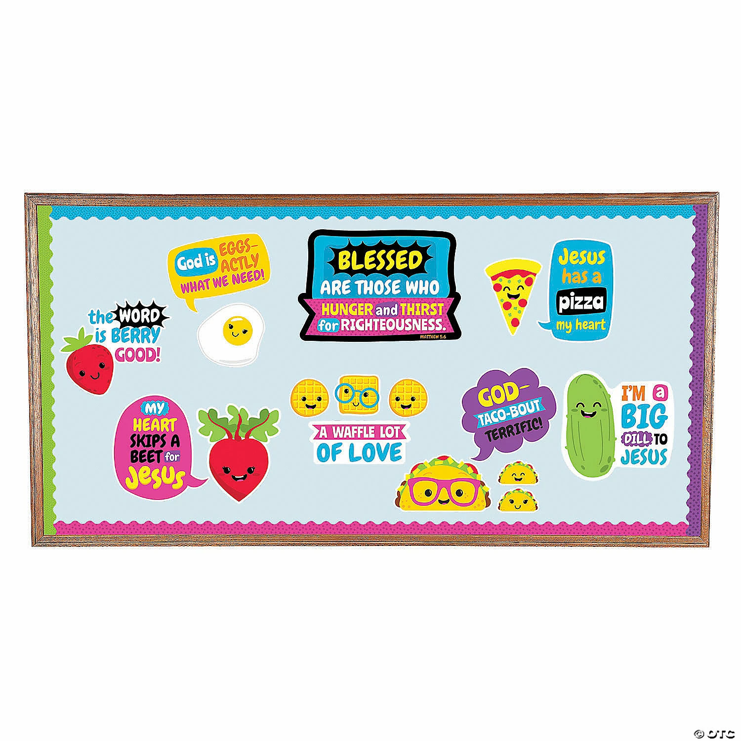 Complete with bulletin board boarders, word bubbles and food character cutouts, this religious classroom decoration set offers endless possibilities for a Sunday School classroom! The cute pizza, taco and other foodie characters and food-themed phrases like, βGod is Eggs-actly What We Need!β, are sure to resonate with students! Cardstock. (31 pcs. per unit) 2″ – 23″ x 4″ – 25″ Β© OTCFaithtastic Food Friends BB Set Instructions
