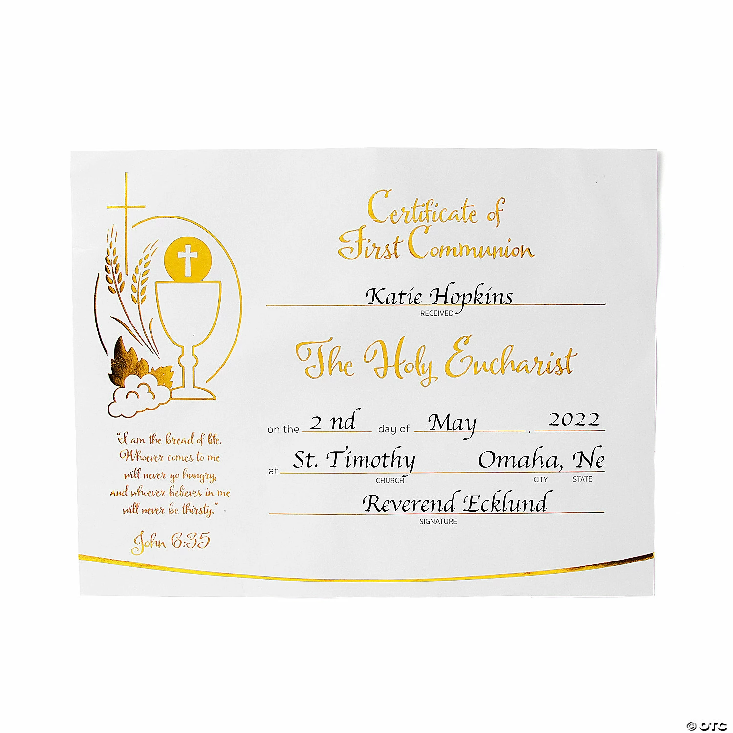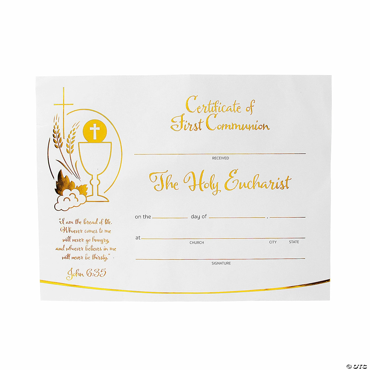 Celebrate a childβs first Holy Communion with these attractive certificates featuring reflective gold foil accents and faith messaging. A lovely way to recognize this important sacrament, these certificates will become keepsakes the childβs parents will treasure for years to come. Help kids recognize the spiritual importance of their First Communion with these certificates. Paper. (30 pcs. per unit) 11″ x 8 1/2″ Β© OTC