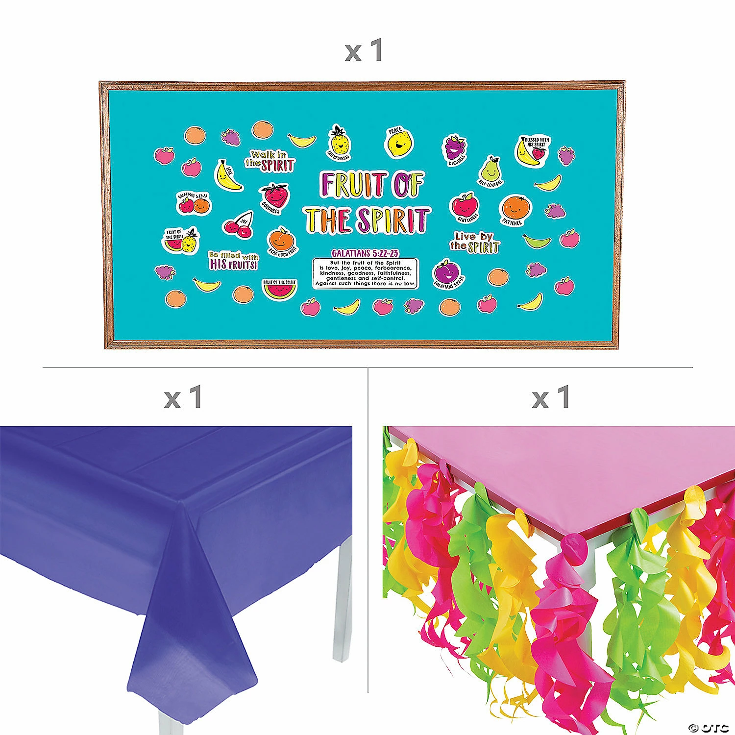With so many goblins and spirits roaming around on Halloween, itโs better to recognize the most important spirit: the Holy Spirit! This colorful trunk-or-treat kit celebrates the Fruit of the Spirit and puts a faith-filled spin on a Halloween activity. A great choice for a church-sponsored trunk-or-treat event, this kit will also certainly stand out at any faith-filled trunk-or-treat event! (60 pcs. per unit) Assortment may vary.Includes:โข 53-Pc. Cardstock Fruit of the Spirit Bulletin Board Set (Includes 30 blank cutouts. 3 1/2″ – 19 1/2″ x 4 1/2″ – 9 1/2″)โข 1 Plastic Purple Tablecloth (54″ x 108″ Thin, slightly transparent. Disposable.)โข 1 Tissue Paper Luau Swirl Table Skirt (9 ft. x 26″)โข 4 Tissue Paper Tutti Frutti Fruit Honeycomb Hanging Decorations (10″ Simple assembly required.)โข 1 Tissue Paper Large Pineapple Honeycomb Decoration (11 3/4″ x 25″ Simple assembly required.)