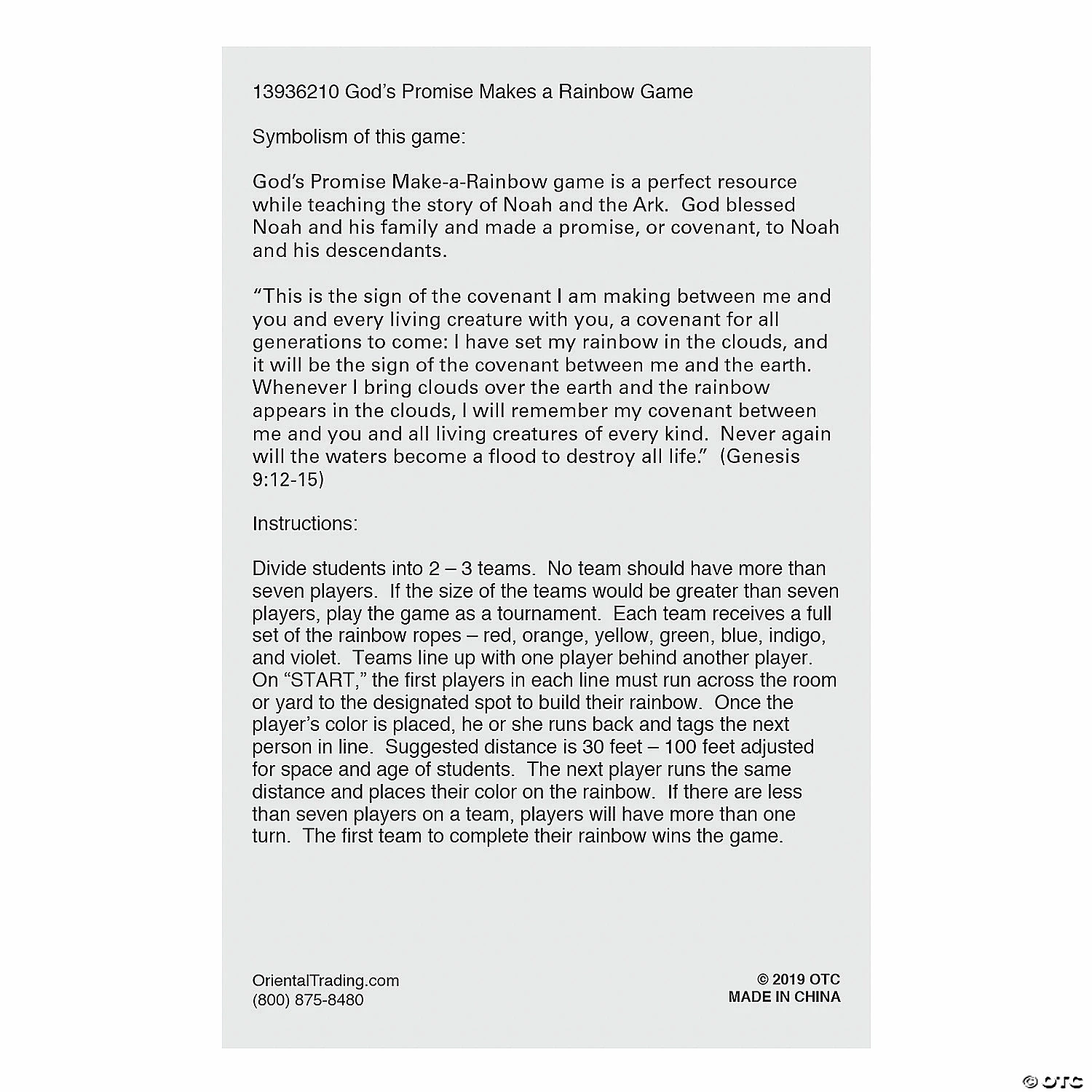 Teach children about Godโs promises through the story of Noah and the Ark and this interactive game! For a fun and meaningful Sunday School activity, play the religious game and then debrief by explaining the symbolism detailed on the instruction sheet. The sheet also describes how to play the game (think relay race!), but you can get creative and make up your own activities too! Includes one 14″ x 18″ nonwoven polyester drawstring bag with sewn-in instruction sheet and twenty-one assorted 24″ polyester ropes. ยฉ OTC