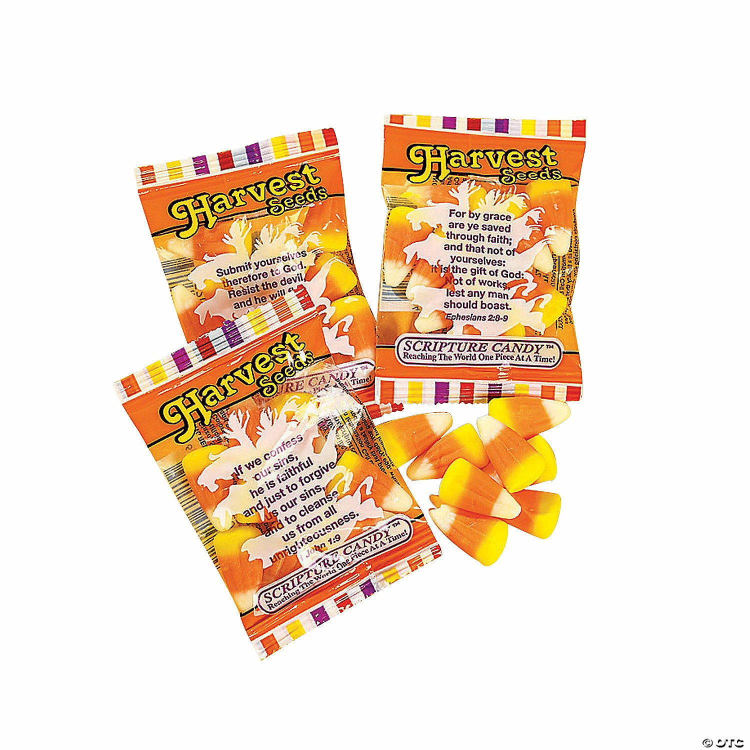 Sow some spiritual seeds with this scripture candy corn! Give these candy corn treats to trick-or-treaters on Halloween for a sweet holiday twist! Each package includes approx. 9 pcs. in a Bible verse wrapper. (17 pkgs. per unit) Total wt., 8.5 oz.β’ Fat-free.β’ Nut-free.β’ Candy is non-returnable. For more information, visit our βReturn Policyβ page located on our website.β’ Made in the USA, Important Country of Origin Information: For certain items sold by OTC on our Web or Mobile sites, country of origin information can change and what is displayed may not be accurate or consistent with manufacturer information. For up to date country of origin information, it is recommended that you rely on product packaging or other manufacturer informationβ’ Nut-free. β’ Ingredient, nutrition, allergen and other product information are provided on our Web and Mobile sites for reference purpose only, without warranty or representation as to accuracy. Manufacturers adjust their labeling regularly and are solely responsible for the accuracy of the information. For general questions concerning these items, please contact our customer service at 800-228-0475.