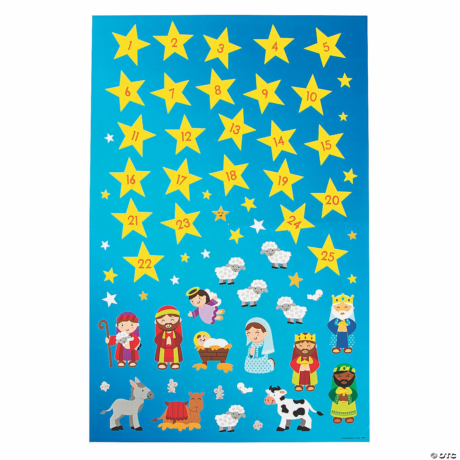 Countdown to Christmas with these kidsโ Advent Calendar Sticker Scenes. A fun way to teach children about Jesusโ birth, they include Nativity stickers depicting Baby Jesus, Mary and Joseph, animals and other visitors. Start the calendars as a Sunday School activity and then send them home with your students. Kids can hang the poster at home and use the numbered star stickers to mark off the days! Includes 12 background sheets and 12 sticker sheets. Paper. 11″ x 17″ ยฉ OTC