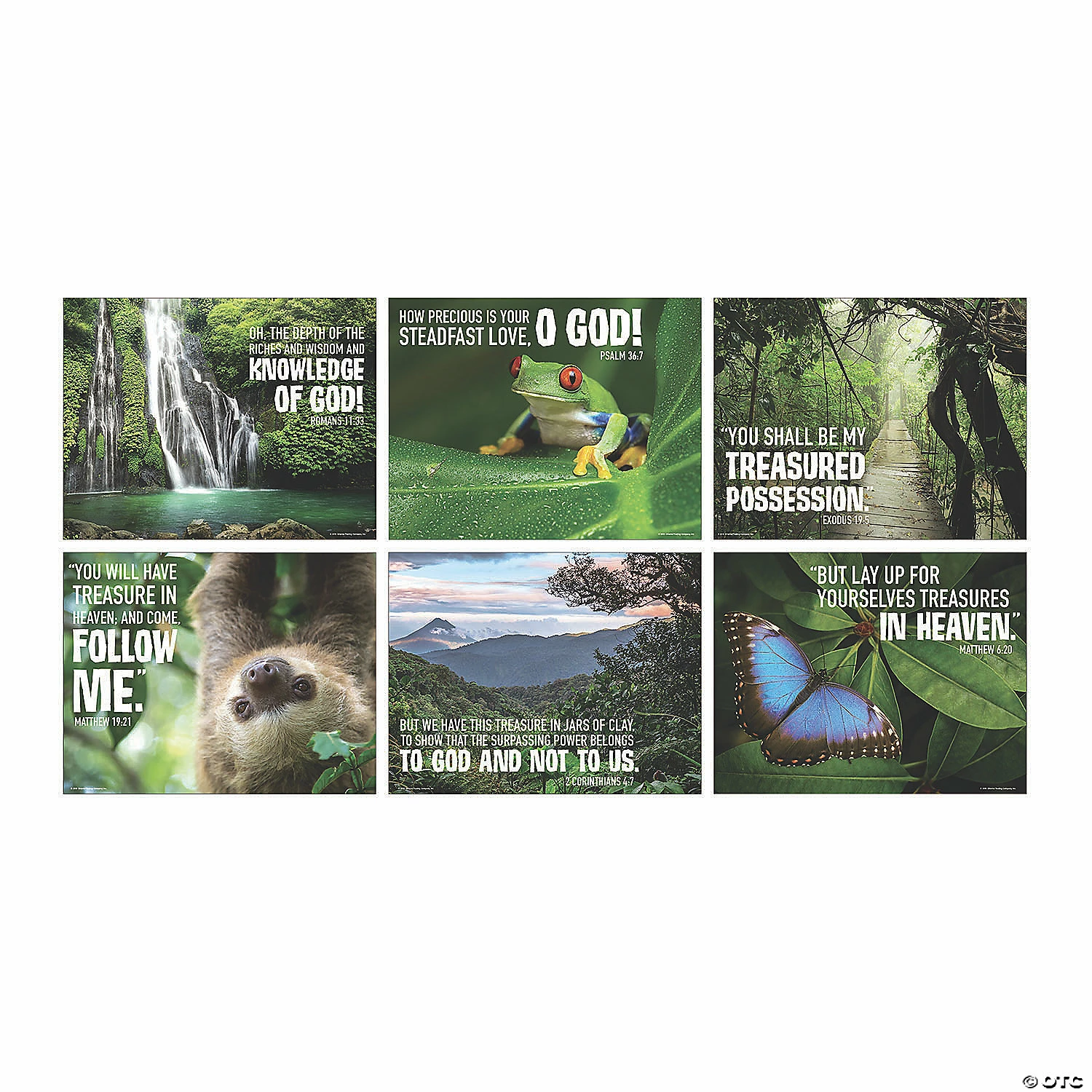 These vibrant posters feature rainforest scenes and Biblical messages, making them the perfect Rainforest VBS wall decorations. Beautiful enough to keep up as Sunday School classroom decoration year-round, these posters are the solution when you donβt already have access to sloths and waterfalls outside your windows. Help kids keep their minds on the knowledge and wisdom of God while enjoying images of His beautiful creations with these VBS posters. Cardstock. (6 pcs. per unit) 22″ x 17″ Β© OTC