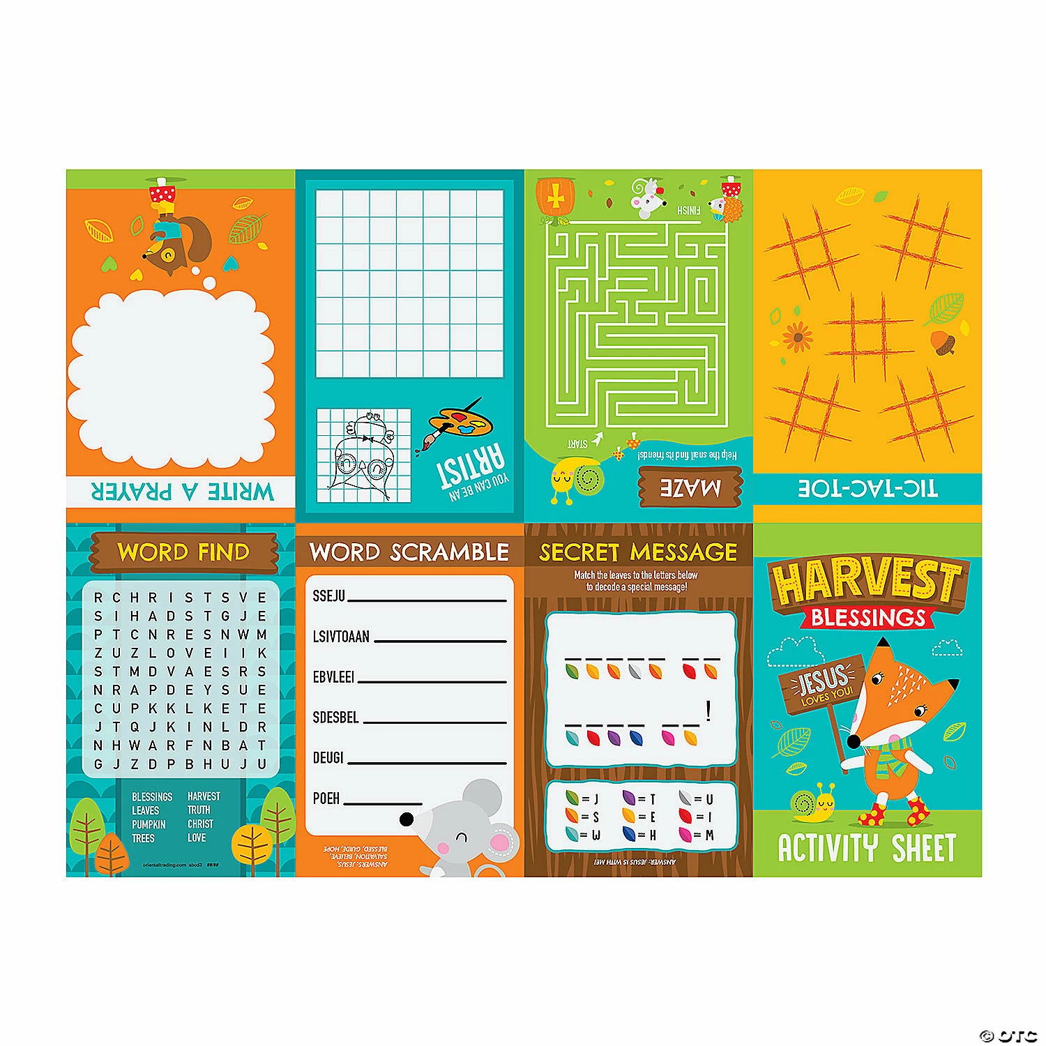 Owl you need is Jesus and this fall activity pad to have some fun! Featuring an adorable design with faith-inspired messages, this stationery is perfect for classroom activities, Sunday School and fall event giveaways. These activity sheets are filled with an assortment of games and puzzles like a word unscramble, maze, word search and so much more. Don’t forget to flip it over and color the fall scene! Includes seven activities on one side and one large picture on the back to color. Paper. (2 dozen per unit) Folded, 2 3/4″ x 4 1/4″; unfolded, 11″ x 8 1/2″. © OTC