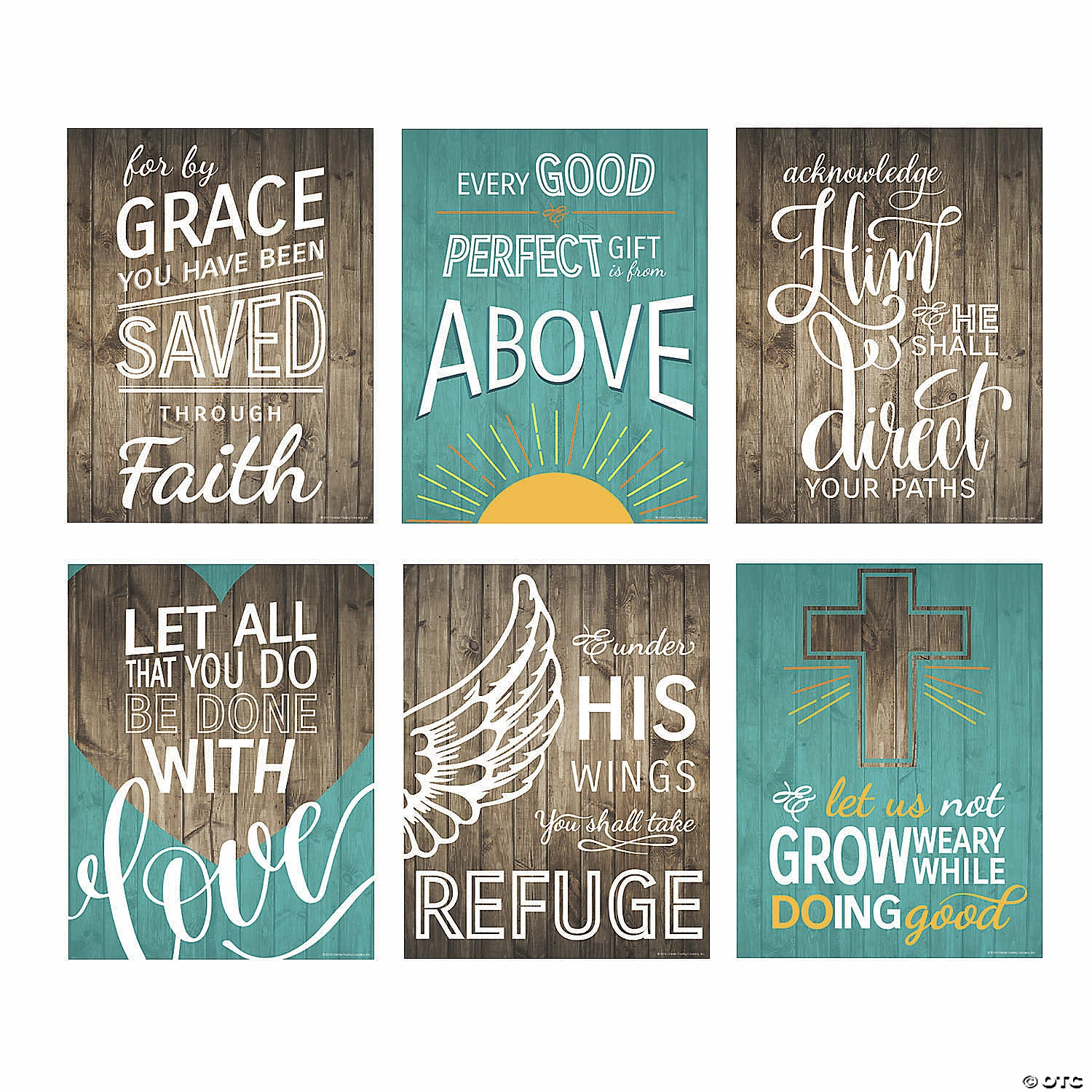Add some shiplap to your spirituality space! With a rustic design and religious sayings like βEvery Good Perfect Gift Is from Above,β these trendy posters are perfect for Sunday School classroom dΓ©cor. With these hung together on a bulletin board or around the room, youβll transform your learning space in an instant! Cardstock. (6 pcs. per unit) 16″ x 20 3/4″ Β© OTC