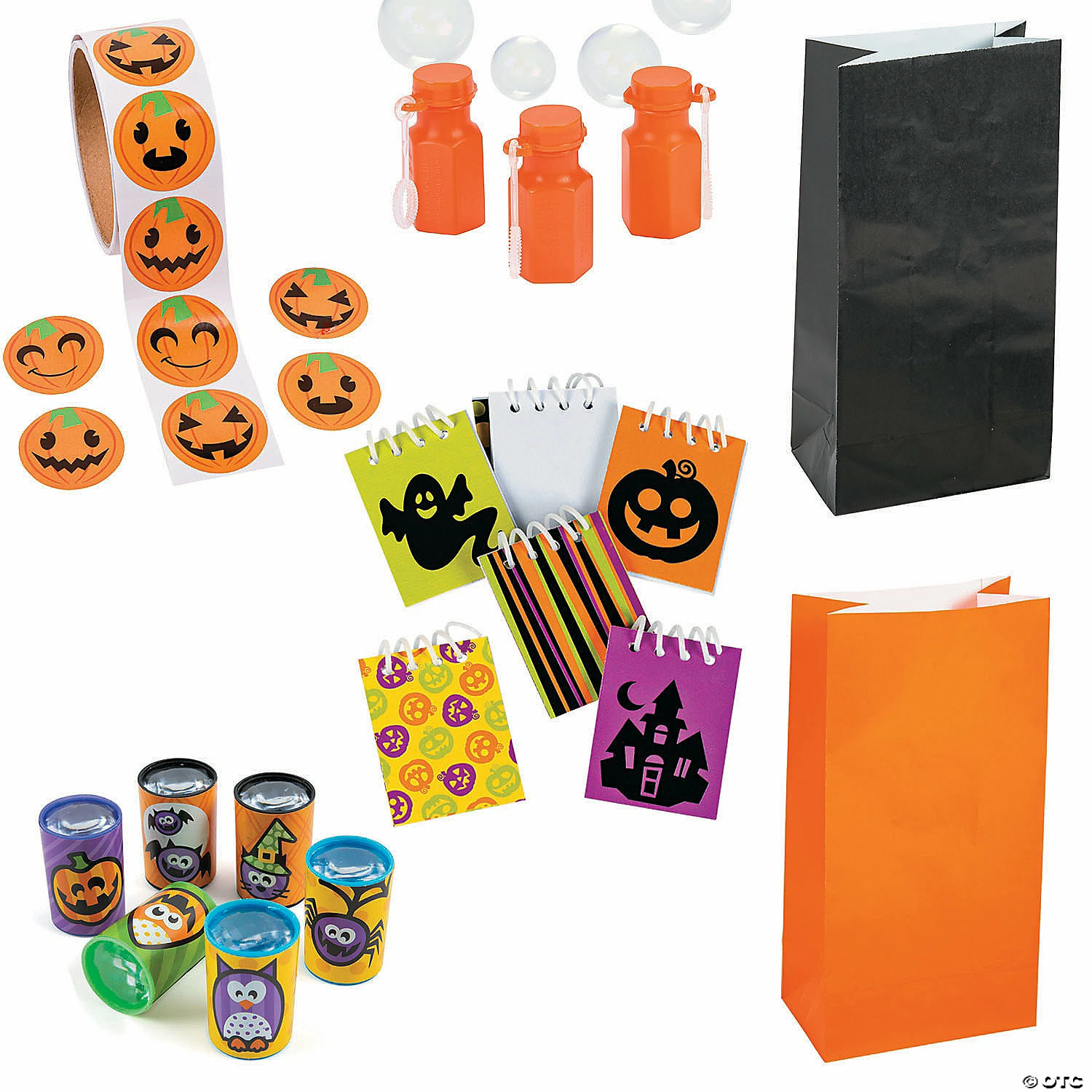 Make your house βthe houseβ for trick-or-treaters in your neighborhood with this helpful kit featuring everything you need to put together up to four dozen treat bags filled with Halloween fun! Great for trick-or-treaters or students, this kit also can create Halloween giveaways at community events or as treats for your youngest customers. (193 pcs. per unit) Simple assembly required. Assortment may vary.Includes:β’ 24 Paper Black Treat Bags (5″ x 3 1/4″ x 10″)β’ 24 Paper Orange Treat Bags (5″ x 3 1/4″ x 10″)β’ 48 Plastic Mini Halloween Prisms (1 3/4″)β’ 48 Plastic Hexagon Orange Mini Bubble Bottles (Includes .3-oz. plastic bottles of bubbles with wands. 1 3/4″)β’ 48 Mini Iconic Halloween Spiral Notepads (1 1/2″ x 2″ 25 pgs.)β’ 1 Paper Jack-Oβ-Lantern Face Sticker Roll (Includes 100 stickers per roll, shrink-wrapped. 1 1/2″)β’ Assortments are subject to change at any time and may vary from picture shown. Substituted items will be similar in nature.